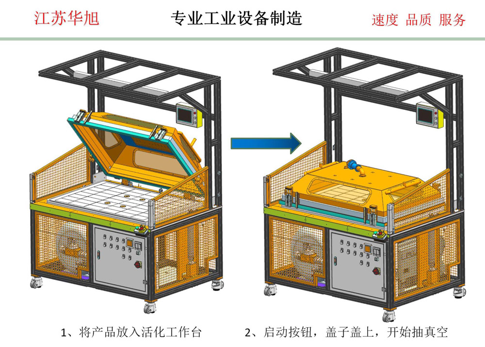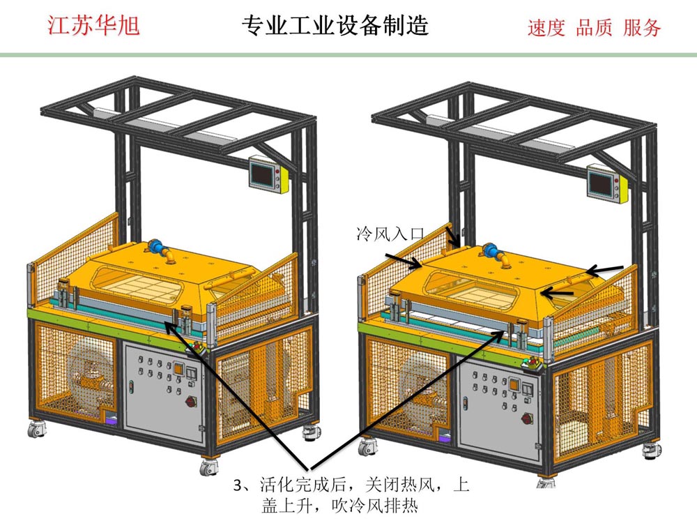 在硅胶皮松开后,将热风箱上升打开,真空先不能关闭,使硅胶皮还没有松开前,用冷风对着硅胶皮降温,使其温度达到激活胶水温度以下,这样表皮与骨架胶水就迅速固化,然后用红外远距离测温技术,确定硅胶表皮温度降到设定温度后,再关闭真空,使硅胶皮松开,热风箱回位,再取件,这样的技术非常到位的解决了这些活化假象,保障了真空活化后的真实撕破力的要求。